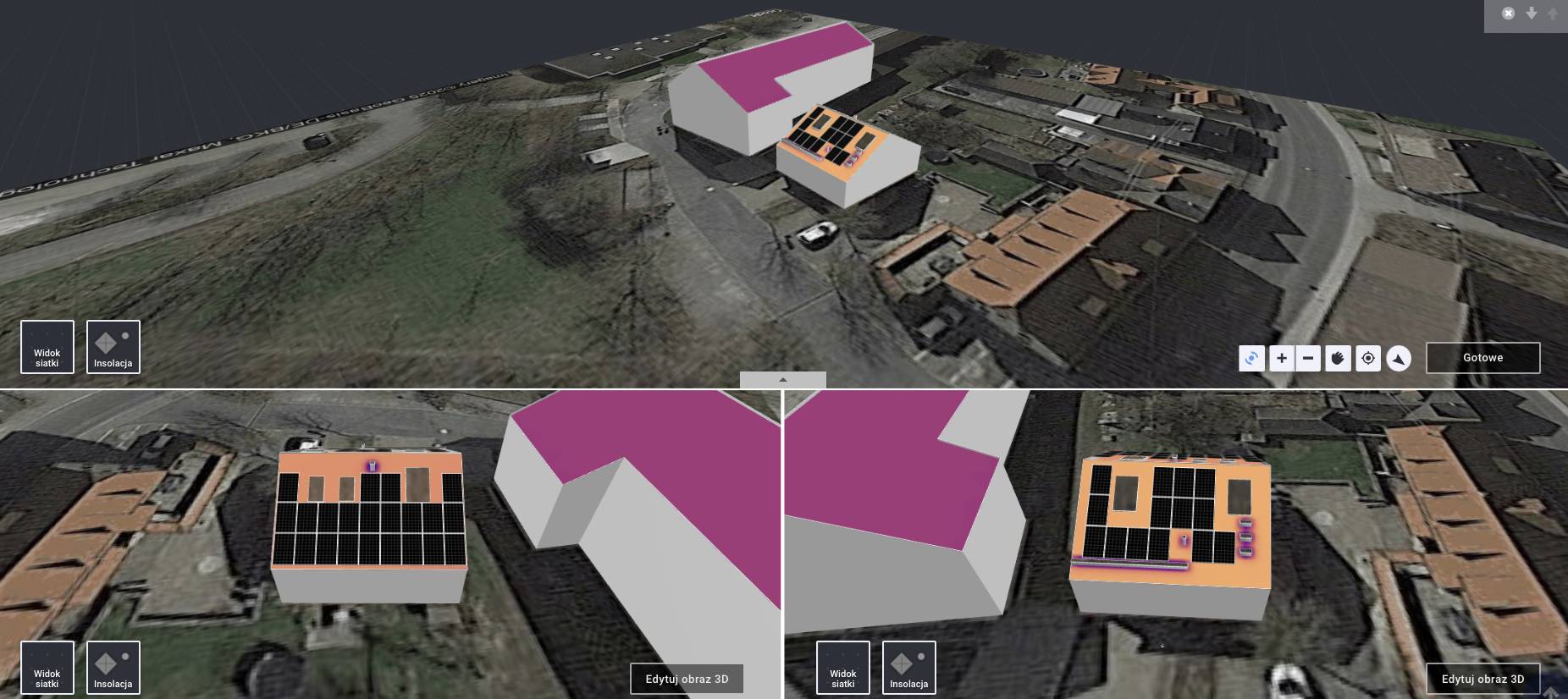 Dzięki dedykowanemu oprogramowaniu tworzymy cyfrowy model budynku i dachu, a następnie umieszczamy na nim moduły fotowoltaiczne. Program automatycznie uwzględnia: